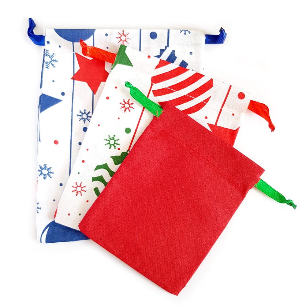 Zestaw woreczków we świąteczne wzory, pomieści drobne prezenty - naszyjniki, kolczyki i bransoletki.