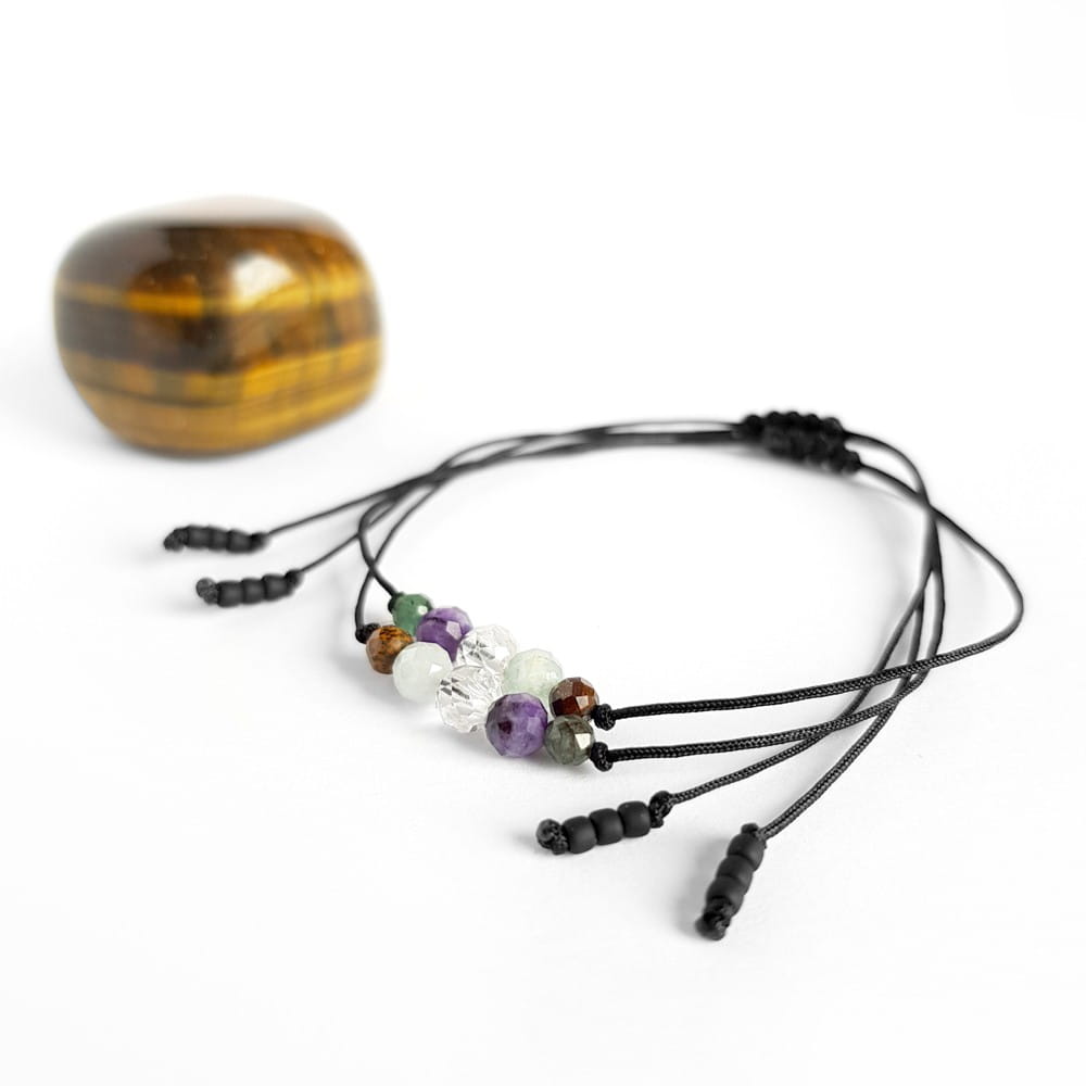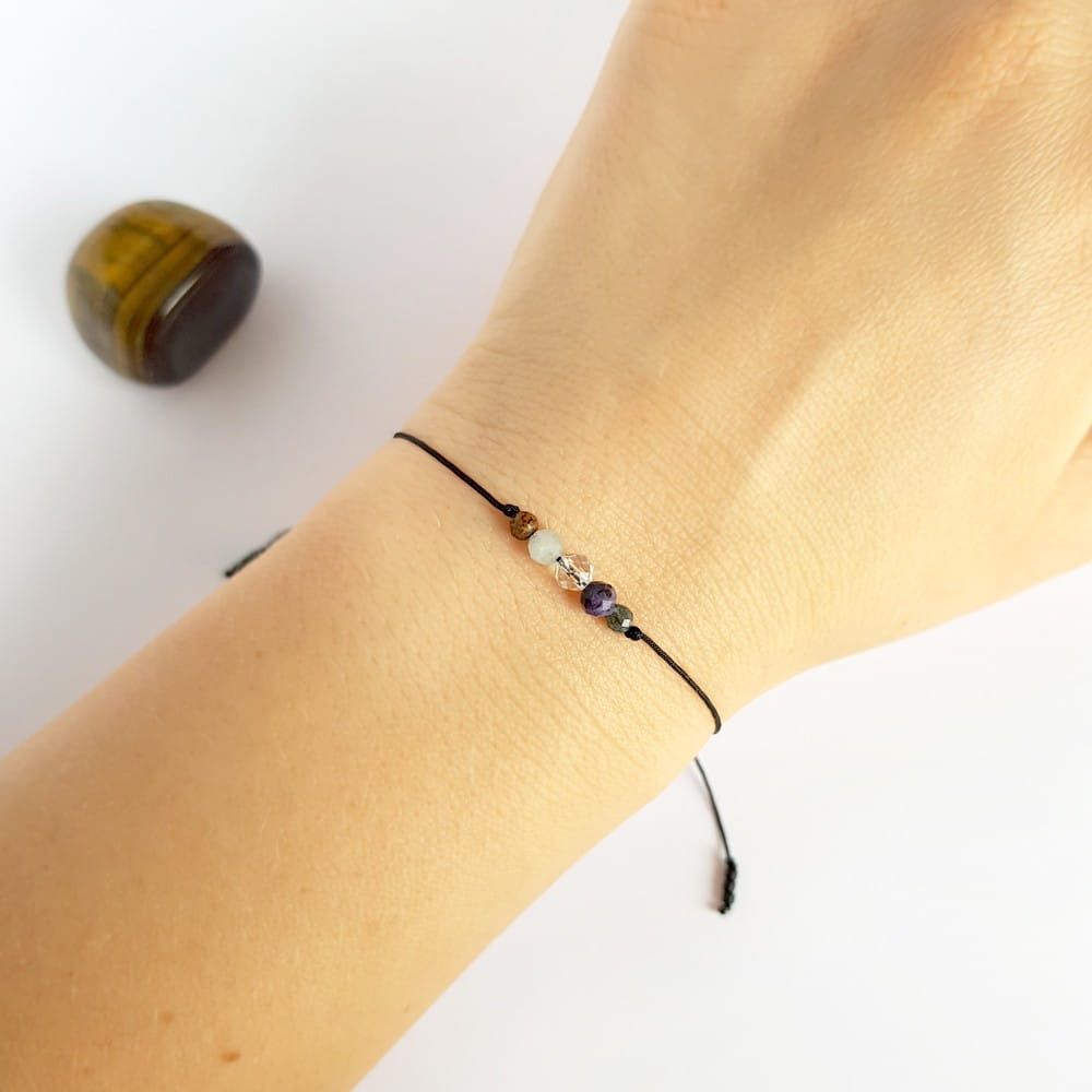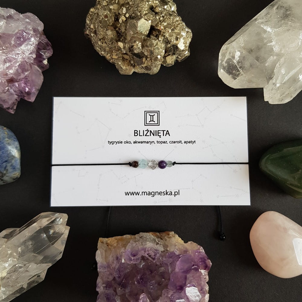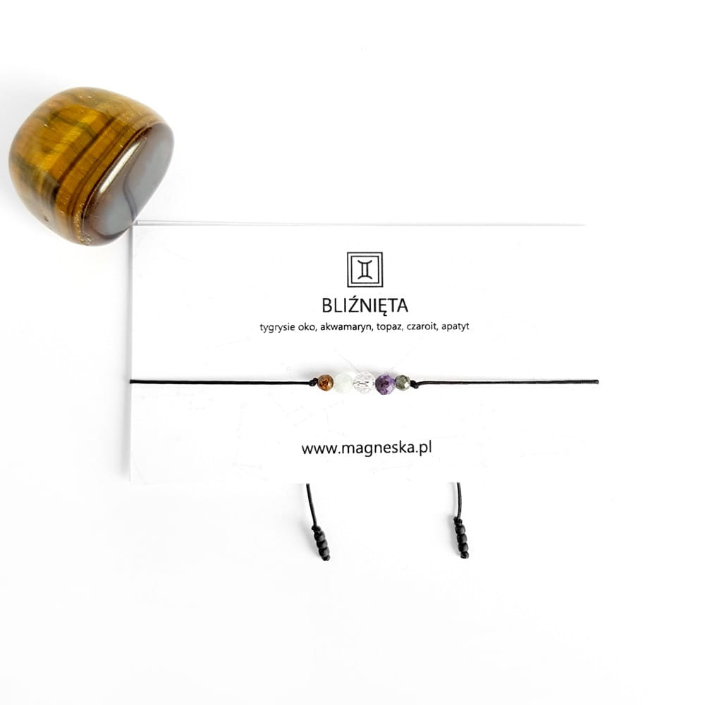 Bransoletka wykonana z kamieni naturalnych przypisywanych osobom spod znaku Bliźniąt: tygrysiego oka, akwamarynu, topazu, czaroitu i apatytu. Bazą bransoletki jest mocny, nylonowy sznurek. Na końcach sznureczków regulacyjnych znajdują się szklane koraliki w kolorze czarnym.