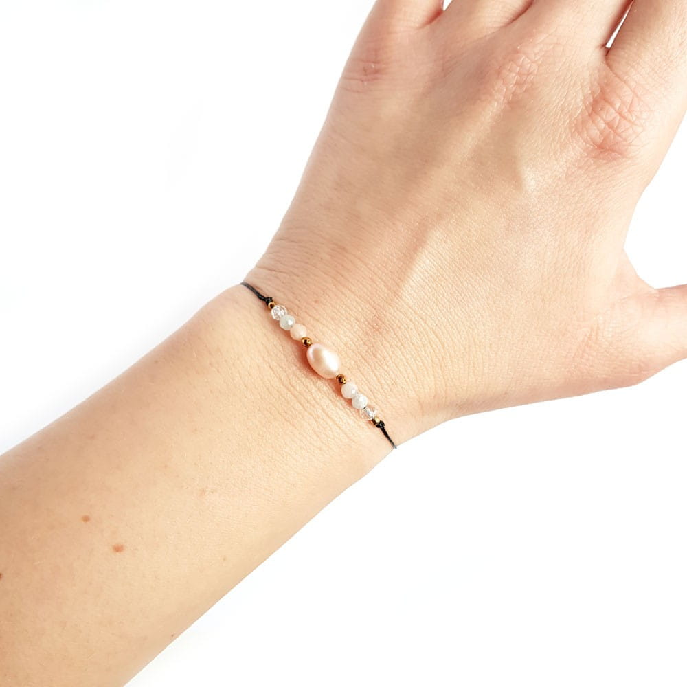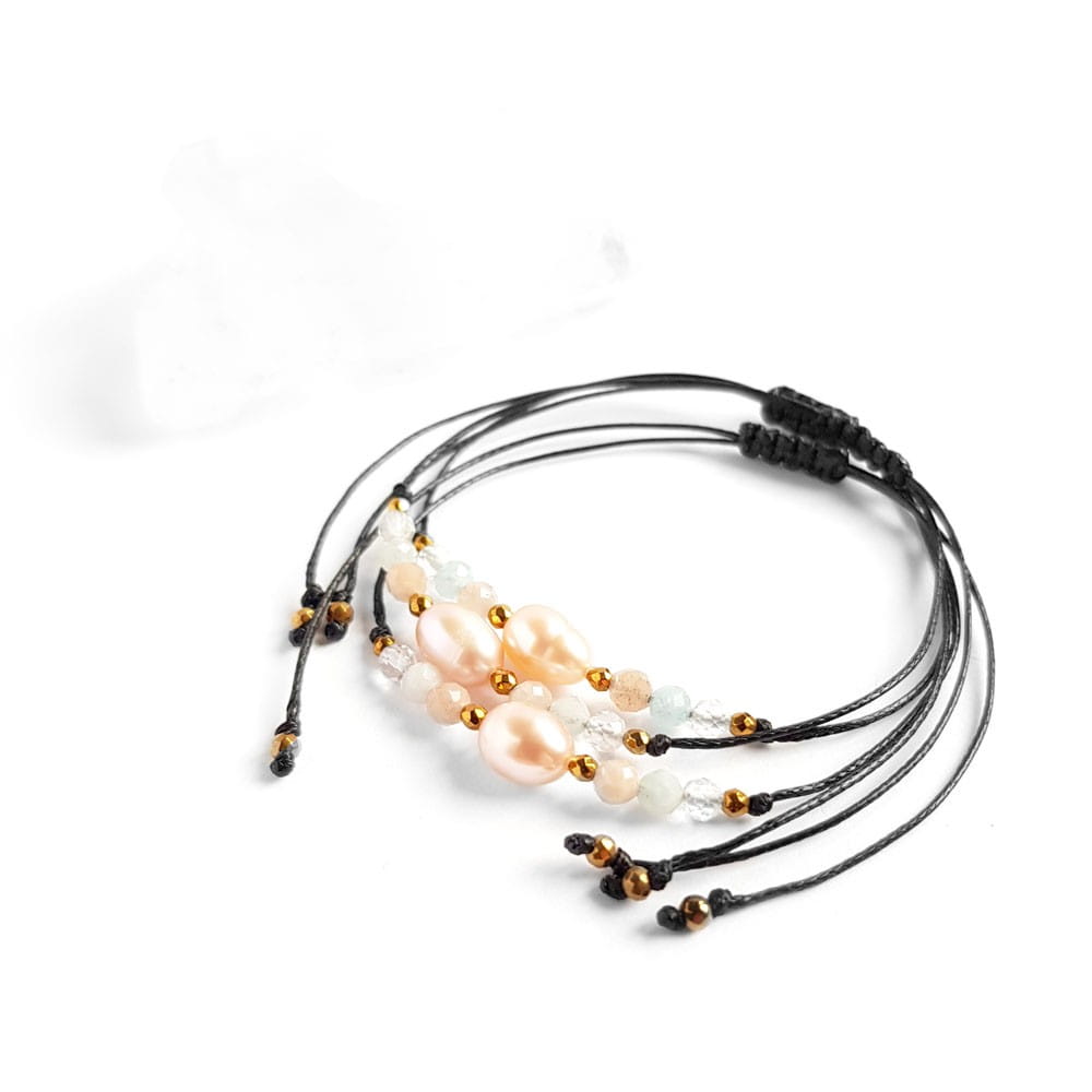 Element dodatkowy stanowi naturalna perła. Bazą bransoletki jest mocny, nylonowy sznurek. Na końcach sznureczków regulacyjnych i pomiędzy kamieniami znajdują się pojedyncze, drobniutkie hematyty.